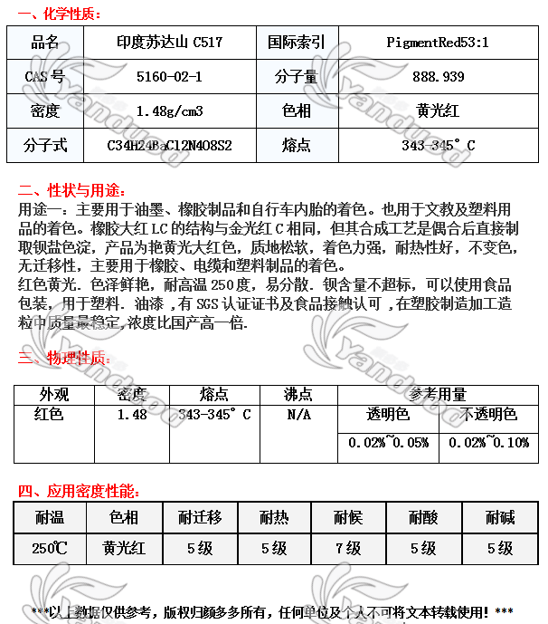 有机颜料 [编码] 3103B [规格] 10公斤/包 [耐温度] 250度 [色相] 黄光红 [生产商] 印度苏达山 [产地] 印度 [索引号] 53:1