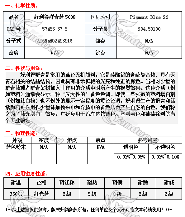 商品属性 [编号] 5403 [生产商] 好利得 [产地] 法国 [耐温度] 350度 [色相] 红光蓝 [规格] 25公斤/包