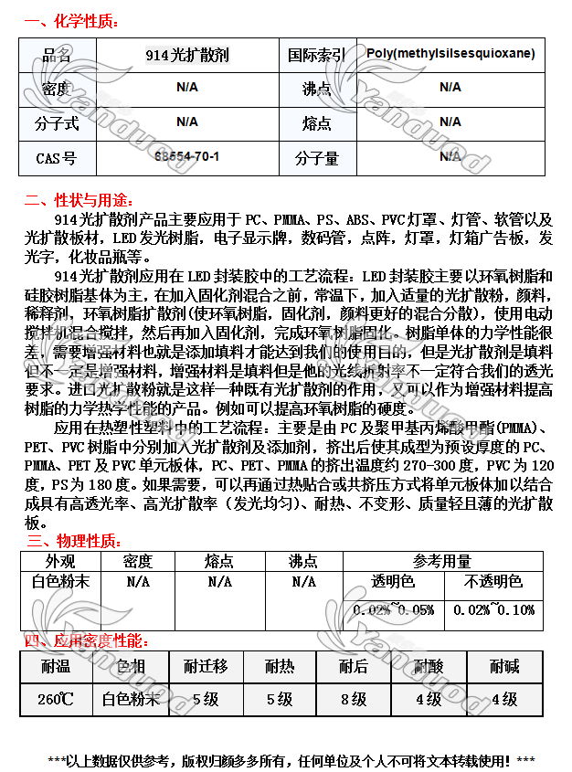 扩散粉 [编号] 914 [规格] 20公斤/箱 [耐温度] 260度 [产地] 日本 [生产商] 根本化学 扩散剂 [色相] 白色粉末