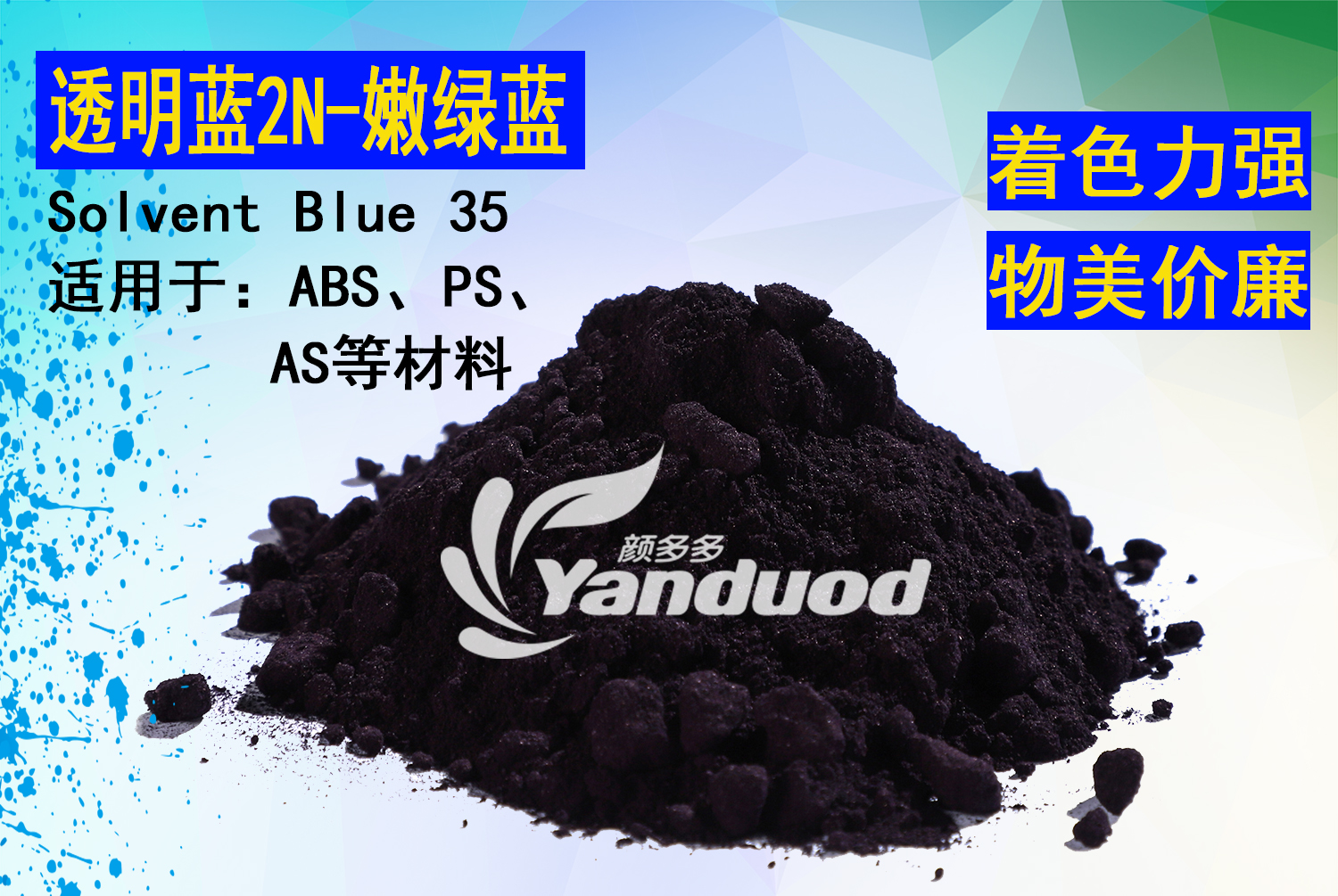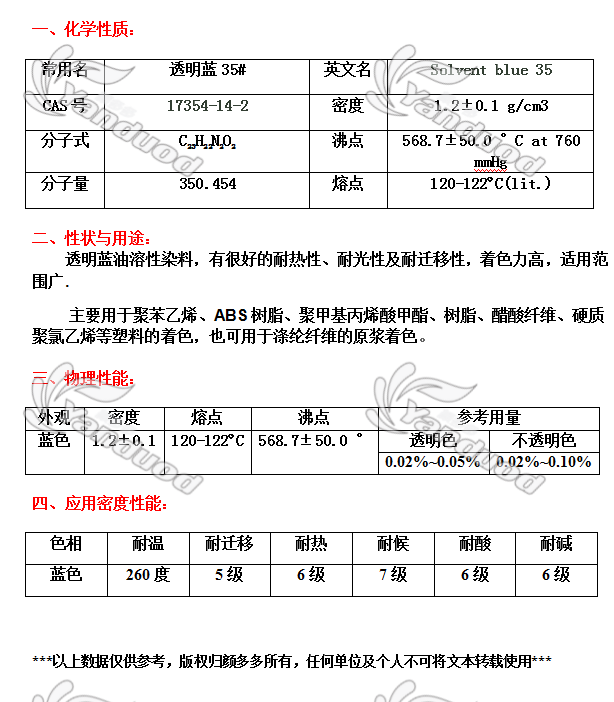 溶剂染料 [编码] 1201A [索引号] solvent blue 35 [规格] 25公斤/桶 [耐温度] 260度 [色相] 嫩绿蓝 [生产商] 国产 [产地] 中国
