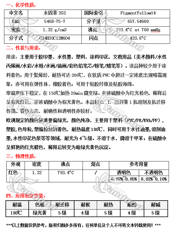 有机颜料 [编码] 3201 [索引号] 14# [规格] 25公斤/包 [耐温度] 180度 [色相] 绿光黄 [产地] 中国 [生产商] 常州北美