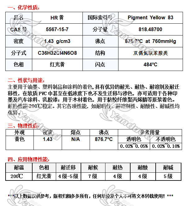 有机颜料 [编码] 3220 [索引号] 83# [规格] 25公斤/包 [耐温度] 200度 [色相] 红光黄 [产地] 中国 [生产商] 常州北美
