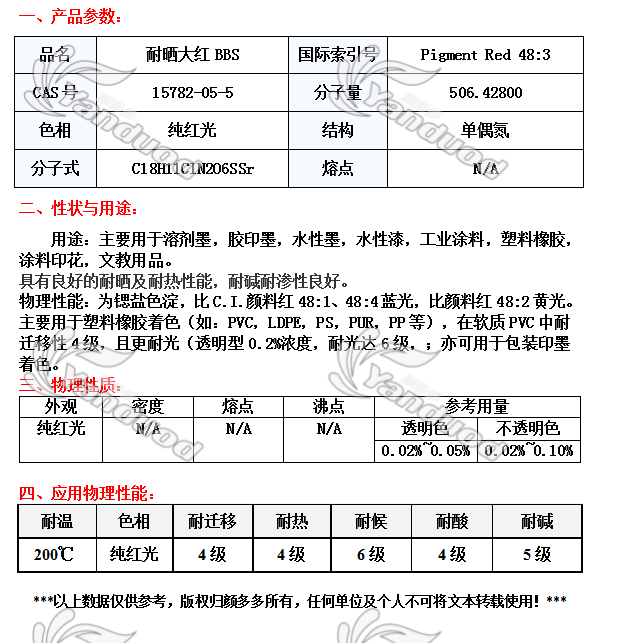 有机颜料 [编码] 3110 [索引号] 48:3 [规格] 25公斤/包 [色相] 纯红光 [产地] 中国 [耐温度] 200度 [生产商] 常州北美
