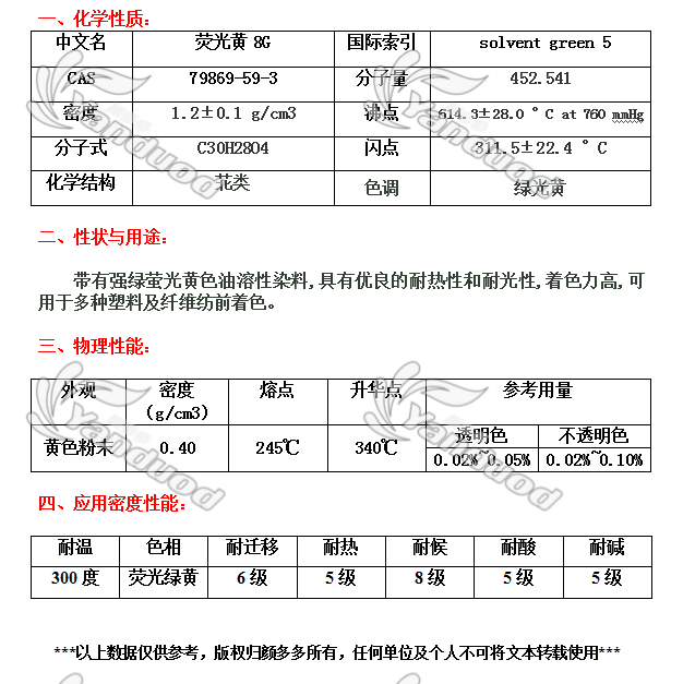 溶剂染料 [编码] 1301 [索引号] 5#绿 [规格] 25公斤/桶 [耐温度] 300度 [色相] 荧光绿黄 [产地] 中国 [生产商] 七彩化学