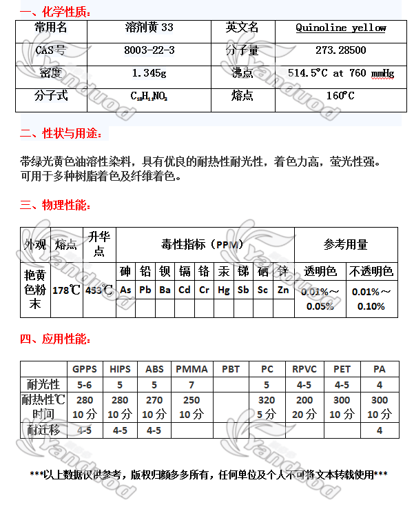 溶剂染料 [编码] 1306A [生产商] 国产 [索引号] 33# [规格] 25公斤/桶 [耐温度] 300度 [色相] 绿光黄 [产地] 马来西亚