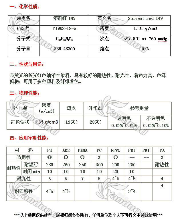 溶剂染料 [编码] 1109 [索引号] 149# [规格] 25公斤/桶 [耐温度] 300度 [色相] 荧光蓝红 [产地] 中国 [生产商] 宁波龙欣