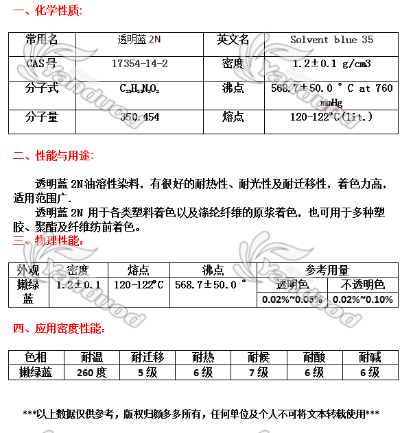 溶剂染料 [编码] 1201 [索引号] 35# [规格] 25公斤/包 [耐温度] 260度 [色相] 嫩绿蓝 [产地] 中国 [生产商] 深圳余氏