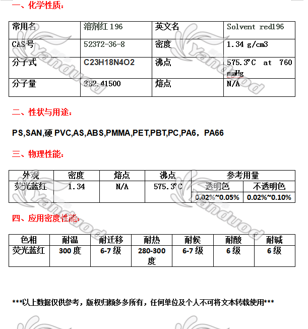 溶剂染料 [编码] 1108 [规格] 10公斤/桶 [耐温度] 300度 [色相] 荧光蓝红 [产地] 中国 [索引号] 196# [生产商] 江苏亚邦