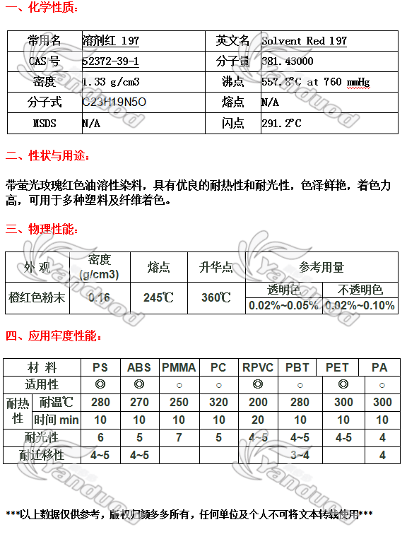 溶剂染料 [编码] 1110 [索引号] 197# [规格] 10公斤/桶 [耐温度] 300度 [色相] 黄光红 [产地] 中国 [生产商] 江苏亚邦