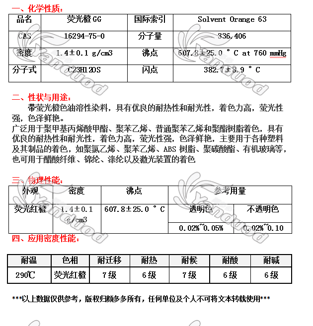 溶剂染料 [编码] 1503B [索引号] solvent orange 63 [规格] 10公斤/桶 [耐温度] 290度 [色相] 荧光红橙 [产地] 中国 [生产商] 江苏亚邦