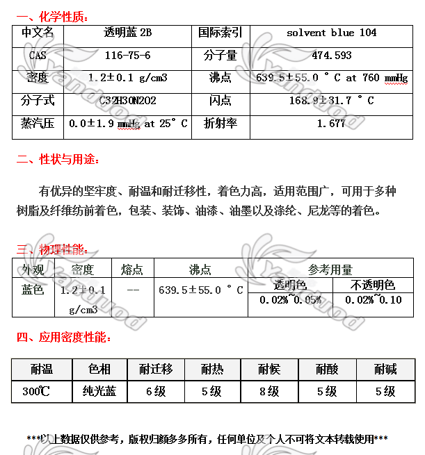 溶剂染料 [编码] 1204 [生产商] 国产 [索引号] solvent blue 104 [规格] 25公斤/桶 [耐温度] 300度 [色相] 纯光蓝 [产地] 中国