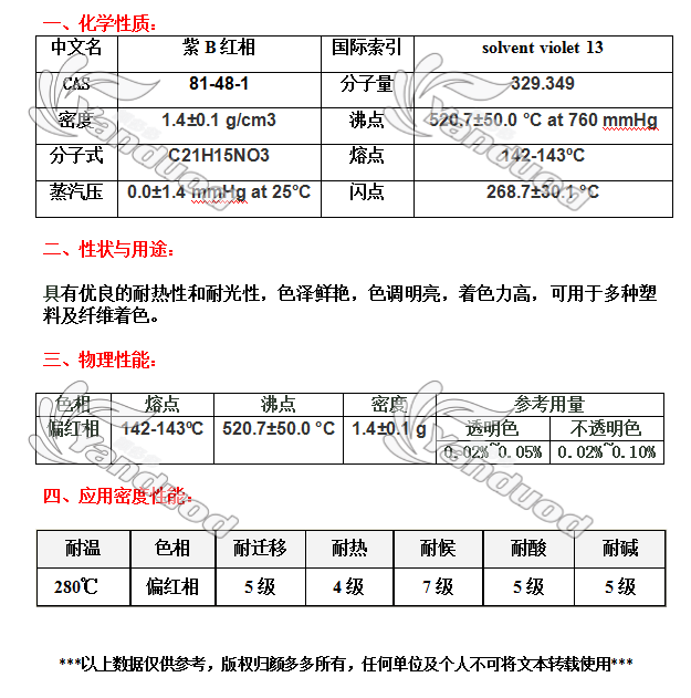 溶剂染料 [编码] 1401 [索引号] solvent violet 13 [规格] 25公斤/桶 [耐温度] 280度 [产地] 中国 [色相] 红光紫 [生产商] 宁波龙欣