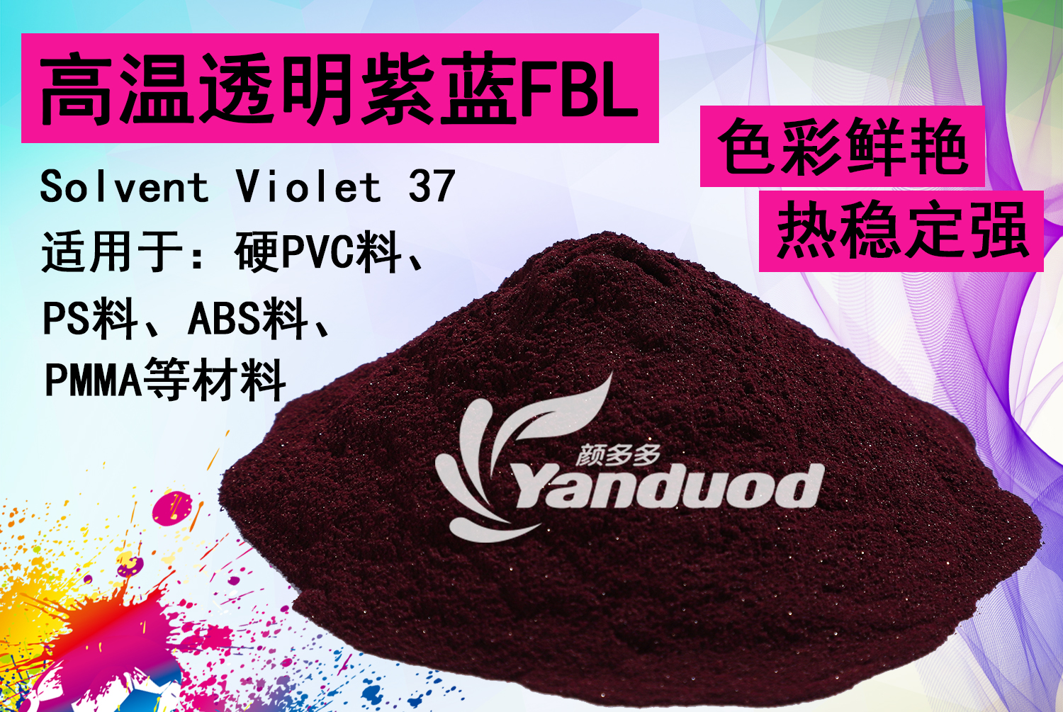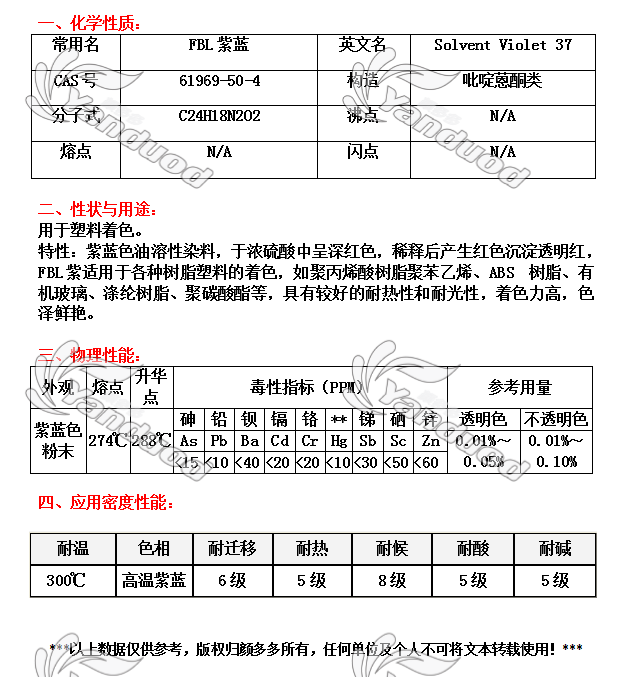 溶剂染料 [编码] 1209 [索引号] solvent violet 37 [规格] 25公斤/桶 [耐温度] 300度 [色相] 高温紫兰 [产地] 中国 [生产商] 宁波龙欣