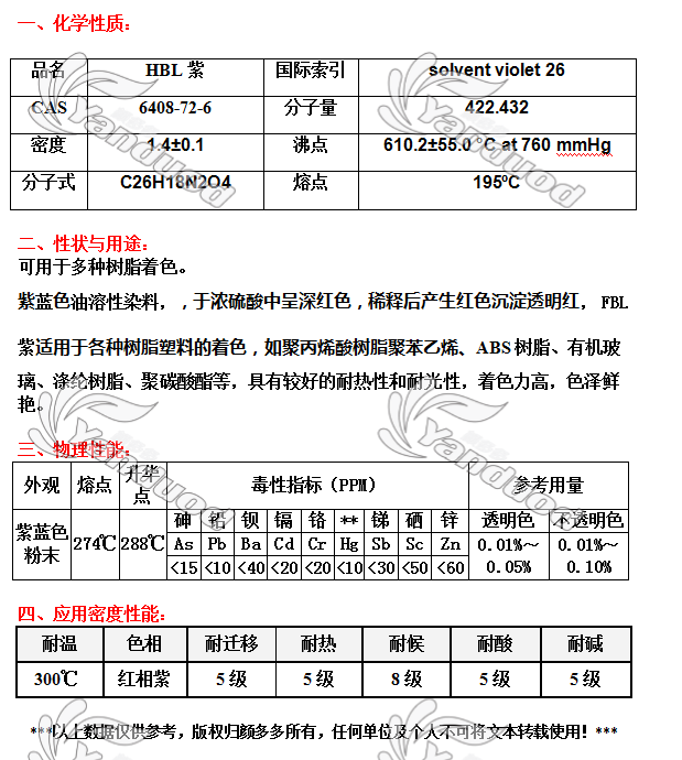 溶剂染料 [编码] 1406 [索引号] solvent violet 26 [规格] 25公斤/桶 [耐温度] 300度 [色相] 红相紫 [产地] 中国 [生产商] 宁波龙欣