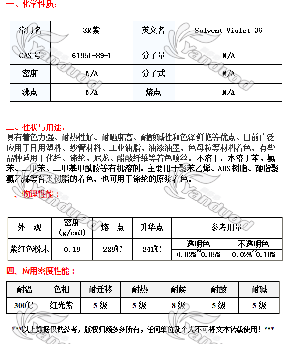 溶剂染料 [编码] 1407 [索引号] solvent violet 36 [规格] 25公斤/桶 [耐温度] 300度 [色相] 红光紫 [产地] 中国 [生产商] 宁波龙欣