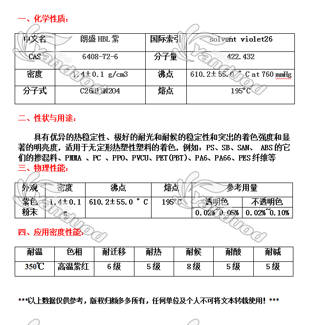 溶剂染料 [编码] 3170 [生产商] 德国朗盛 [索引号] solvent violet 26 [耐温度] 350度 [色相] 紫红 [产地] 德国 [规格] 15公斤/包