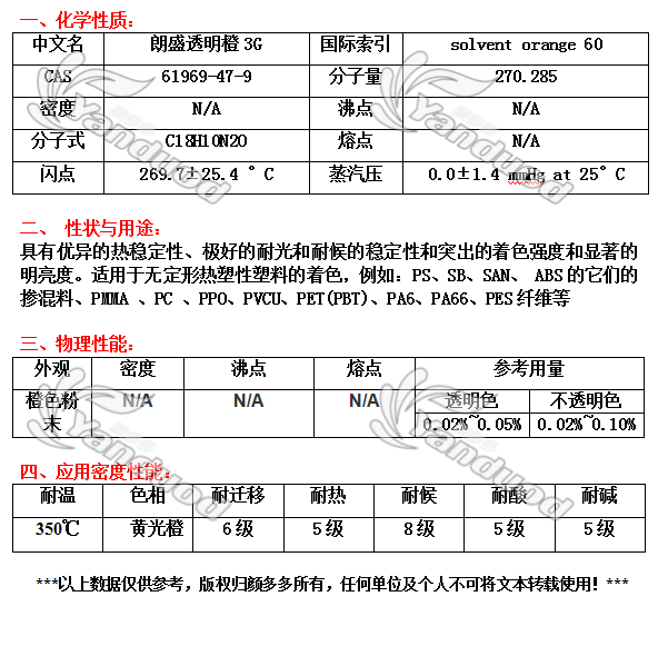 溶剂染料 [编码] 3416 [生产商] 德国朗盛 [索引号] solvent orange 60 [耐温度] 350度 [色相] 黄光橙 [产地] 德国 [规格] 10公斤/包