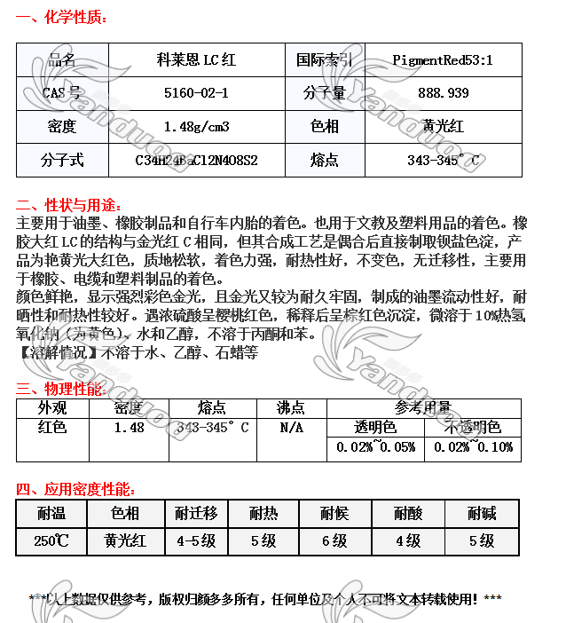 有机颜料 [编码] 3102 [生产商] 科莱恩 [索引号] PigmentRed53:1 [耐温度] 250度 [色相] 黄光红 [产地] 中国 [规格] 25公斤/包