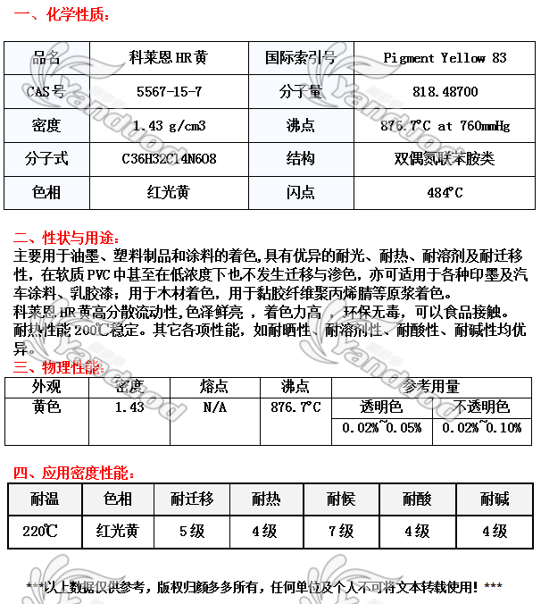 有机颜料 [编码] 3221 [生产商] 科莱恩 [索引号] PigmentYellow83 [规格] 25公斤/箱 [耐温度] 220度 [色相] 红光黄 [产地] 中国