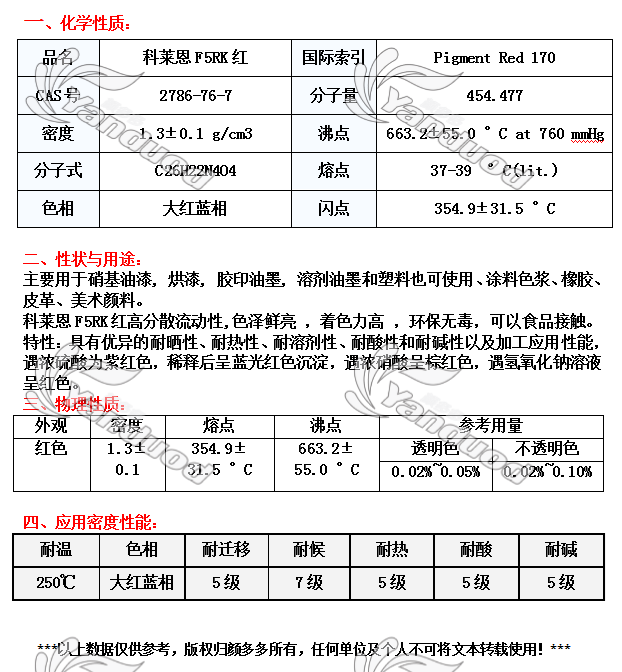 有机颜料 [编码] 3129 [生产商] 科莱恩 [索引号] PigmentRed 170 [规格] 25公斤/箱 [耐温度] 250度 [色相] 大红蓝 [产地] 中国