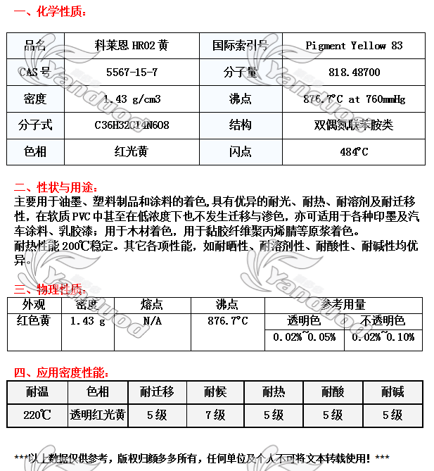 有机颜料 [编码] 3222 [生产商] 科莱恩 [索引号] PigmentYellow83 [规格] 25公斤/箱 [耐温度] 220度 [色相] 透明红 [产地] 中国