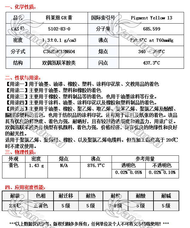 有机颜料 [编码] 3224 [生产商] 科莱恩 [索引号] PigmentYellow13 [规格] 25公斤/箱 [耐温度] 200度 [色相] 正黄色 [产地] 德国