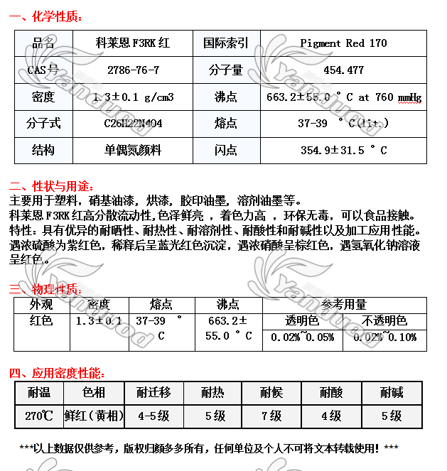 有机颜料 [编码] 3127 [生产商] 科莱恩 [索引号] Pigment Red 170 [规格] 25公斤/箱 [耐温度] 270度 [色相] 鲜红黄 [产地] 中国