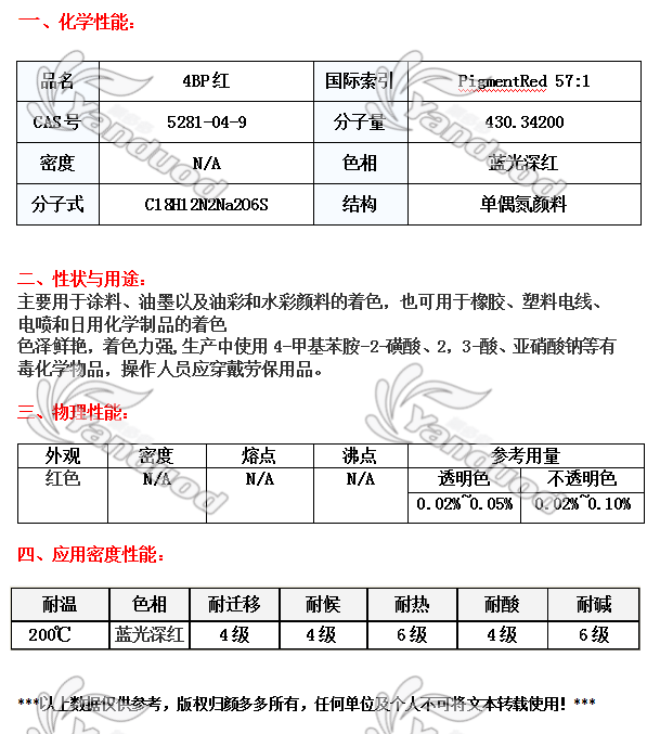 有机颜料 [编码] 3123 [索引号] PigmentRed 57:1 [耐温度] 200度 [色相] 蓝光深红 [产地] 中国 [规格] 20公斤/包 [生产商] 常州北美