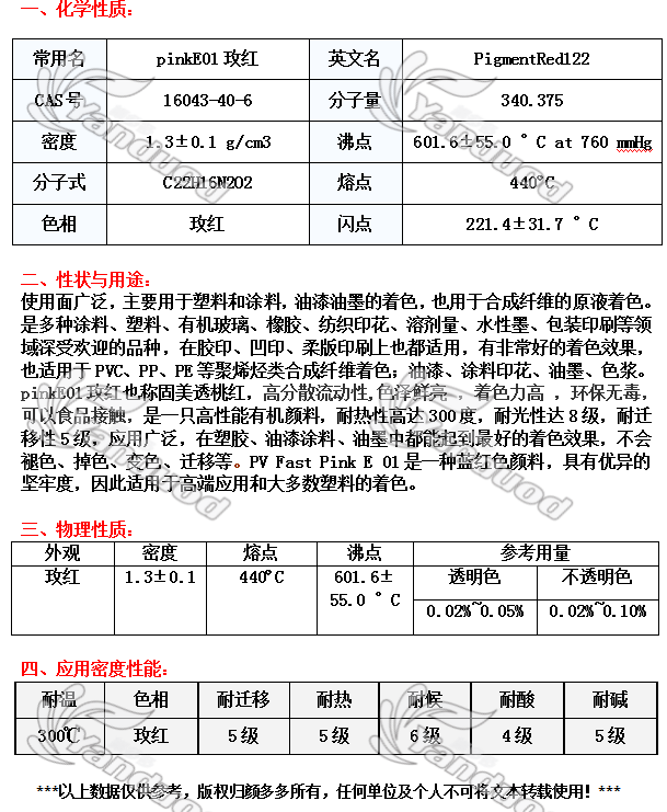 有机颜料 [编码] 3116 [生产商] 科莱恩 [索引号] PigmentRed 122 [耐温度] 300度 [色相] 玫红 [产地] 德国 [规格] 20公斤/包