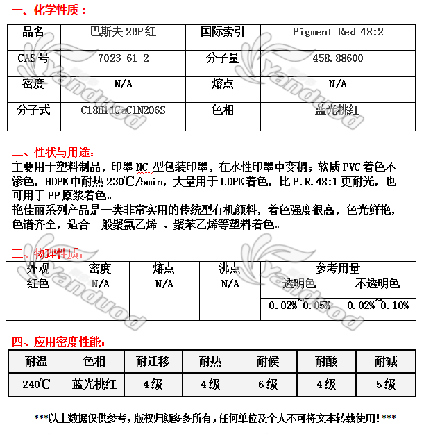 有机颜料 [编码] 3121A [生产商] 巴斯夫 [索引号] Pigment Red 48:2 [规格] 10公斤/包 [耐温度] 240度 [色相] 蓝光桃红 [产地] 韩国
