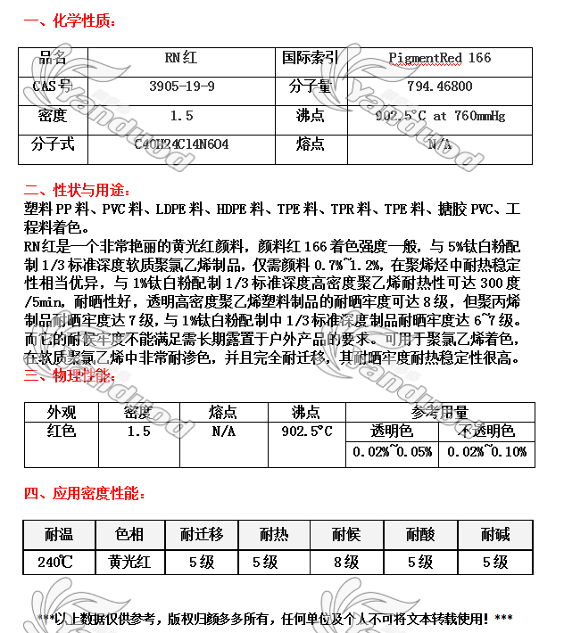 有机颜料 [编码] 3166 [索引号] PigmentRed 166 [耐温度] 240度 [色相] 黄光红 [产地] 中国 [规格] 20公斤/箱 [生产商] 常州北美