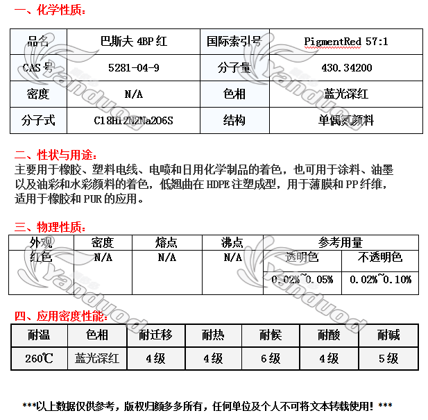 有机颜料 [编码] 3123A [生产商] 巴斯夫 [索引号] PigmentRed57:1 [规格] 20公斤/包 [耐温度] 260度 [色相] 蓝光红 [产地] 韩国