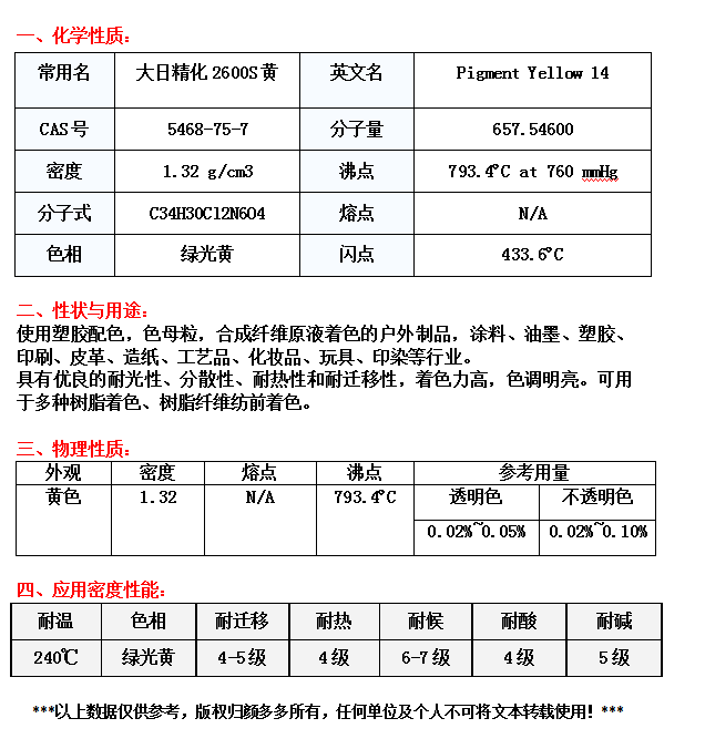 有机颜料 [编码] 3211A [生产商] 大日精化 [索引号] PigmentYellow14 [规格] 10公斤/包 [耐温度] 240度 [色相] 绿光黄 [产地] 日本