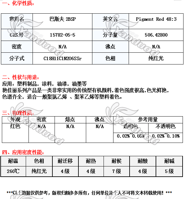 有机颜料 [编码] 3122 [生产商] 巴斯夫 [索引号] PigmentRed 48:2 [规格] 10公斤/包 [耐温度] 260度 [色相] 纯红光 [产地] 韩国