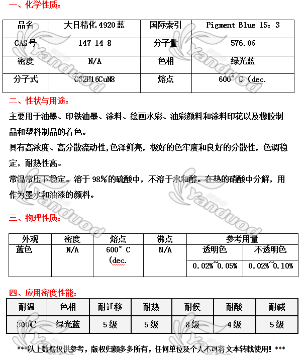 有机颜料 [编码] 4106 [生产商] 大日精化 [索引号] 大日精化 [耐温度] 300度 [色相] 透明绿光蓝 [规格] 15公斤/包 [产地] 西班牙