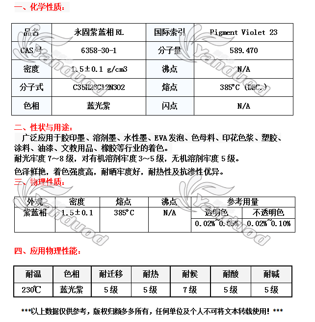 有机颜料 [编码] 3304 [索引号] PigmentViolet23 [规格] 10公斤/包 [耐温度] 230度 [产地] 中国 [色相] 蓝光紫 [生产商] 南通龙翔