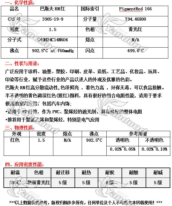 有机颜料 [编码] 3112 [生产商] 巴斯夫 [索引号] PigmentRed 166 [规格] 20公斤/箱 [耐温度] 300度 [色相] 艳丽黄光红 [产地] 德国