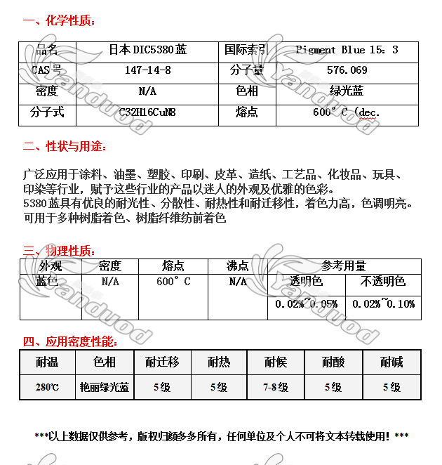 有机颜料 [编码] 4108A [生产商] 日本DIC [索引号] PigmentBlue15:3 [规格] 10公斤/包 [耐温度] 280度 [色相] 透明绿光蓝 [产地] 日本