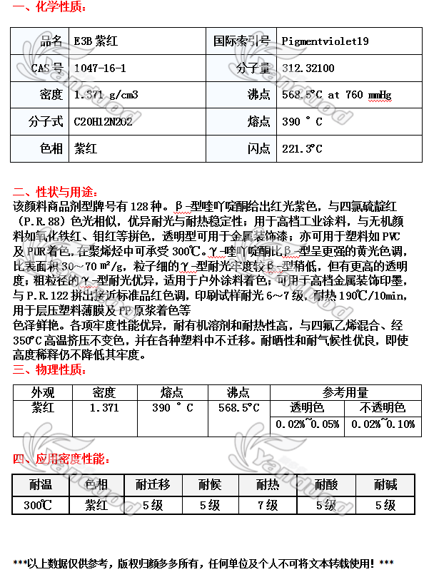 有机颜料 [编码] 3306 [生产商] 国产 [索引号] Pigmentviolet19 [规格] 10公斤/包 [耐温度] 300度 [色相] 紫红 [产地] 中国
