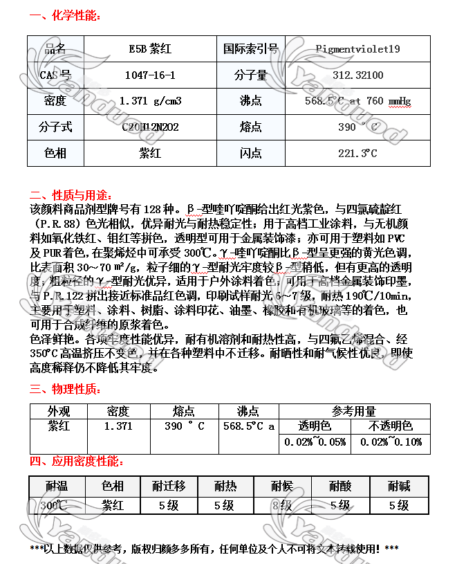 有机颜料 [编码] 3405 [索引号] Pigmentviolet19 [规格] 10公斤/包 [耐温度] 300度 [色相] 紫红 [产地] 中国 [生产商] 百合花