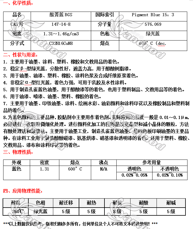 有机颜料 [编码] 4103B [索引号] PigmentBlue15:3 [规格] 25公斤/包 [耐温度] 260度 [色相] 绿光蓝 [产地] 中国 [生产商] 江苏亚邦