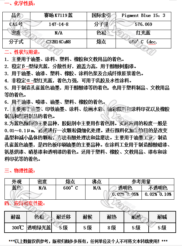 有机颜料 [编码] 4123 [规格] 25公斤/包 [耐温度] 300度 [色相] 透明绿光蓝 [生产商] 马来赛旸 [索引号] 15:3 [产地] 印度