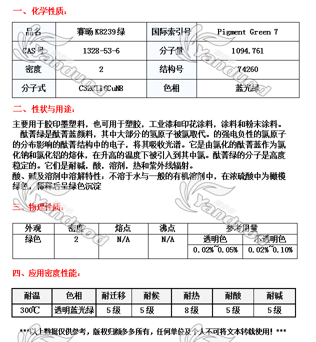 有机颜料 [编码] 4308 [规格] 25公斤/包 [耐温度] 300度 [色相] 透明蓝光绿 [生产商] 马来赛旸 [索引号] 7# [产地] 印度