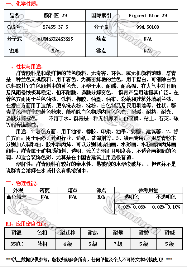 商品属性 [编号] 5412 [生产商] 国产 [产地] 中国 [规格] 25公斤/包 [耐温度] 350度 [色相] 红光蓝