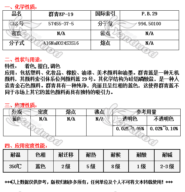 商品属性 [编号] 5405 [生产商] 好利得 [规格] 25公斤/包 [耐温度] 350度 [色相] 蓝色 [产地] 哥伦比亚