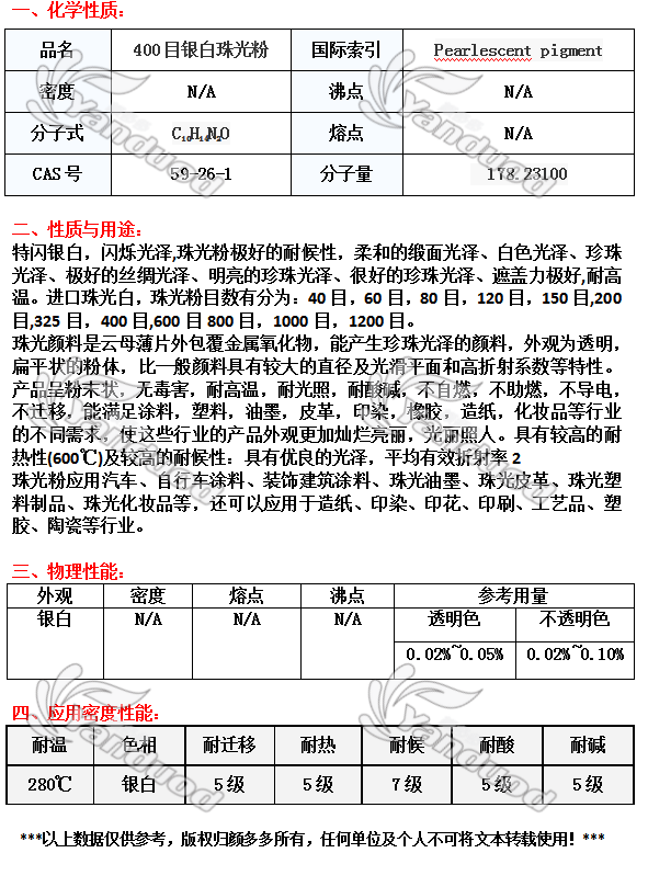 商品属性 [编码] 5308 [生产商] 国产 [规格] 25kg/桶 [耐温度] 280度 [色相] 银白 [产地] 中国