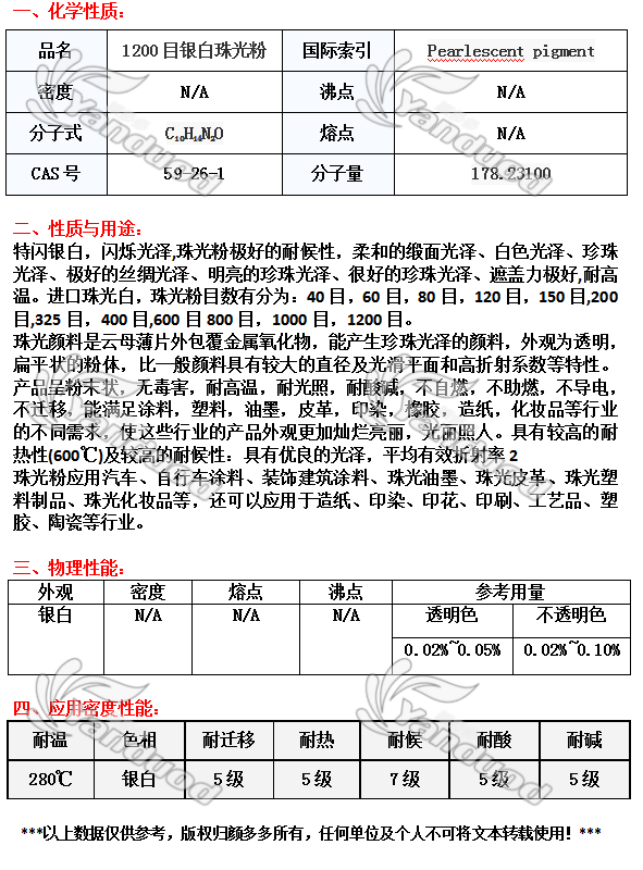 商品属性 [编码] 5300 [生产商] 国产 [规格] 25kg/桶 [耐温度] 280度 [色相] 银白 [产地] 中国