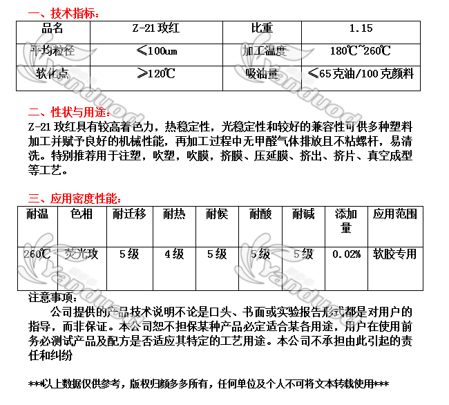 AX系列 [编码] 8221 [生产商] 国产 [耐温度] 260度 [色相] 荧光玫红 [规格] 22.68kg/箱 [产地] 中国