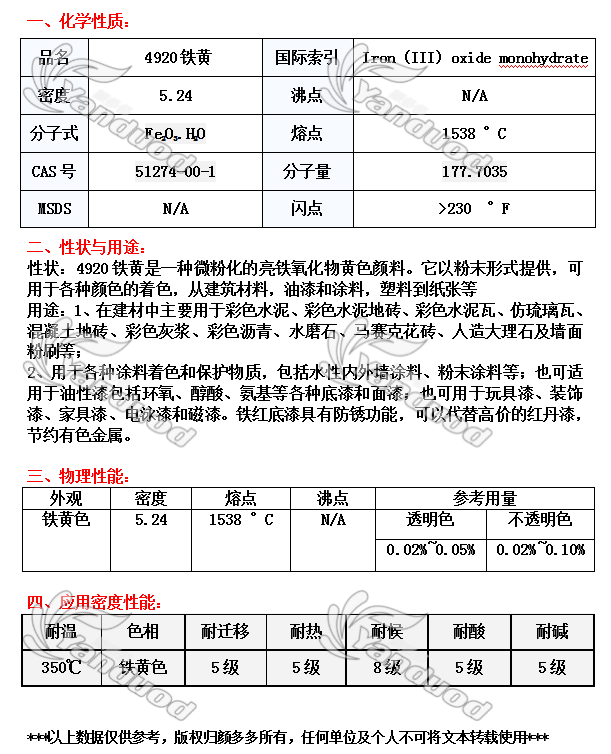 氧化铁 [编码] 3513 [规格] 25公斤/包 [耐温度] 350度 [色相] 铁黄 [生产商] 德国拜耳乐 [产地] 中国