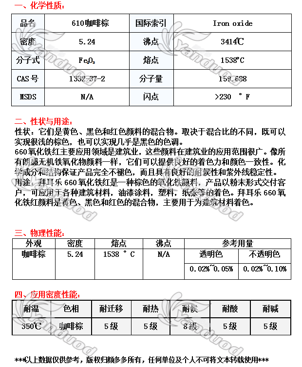 氧化铁 [编码] 3503 [规格] 25公斤/包 [耐温度] 300度 [色相] 咖啡棕 [生产商] 德国拜耳乐 [产地] 中国